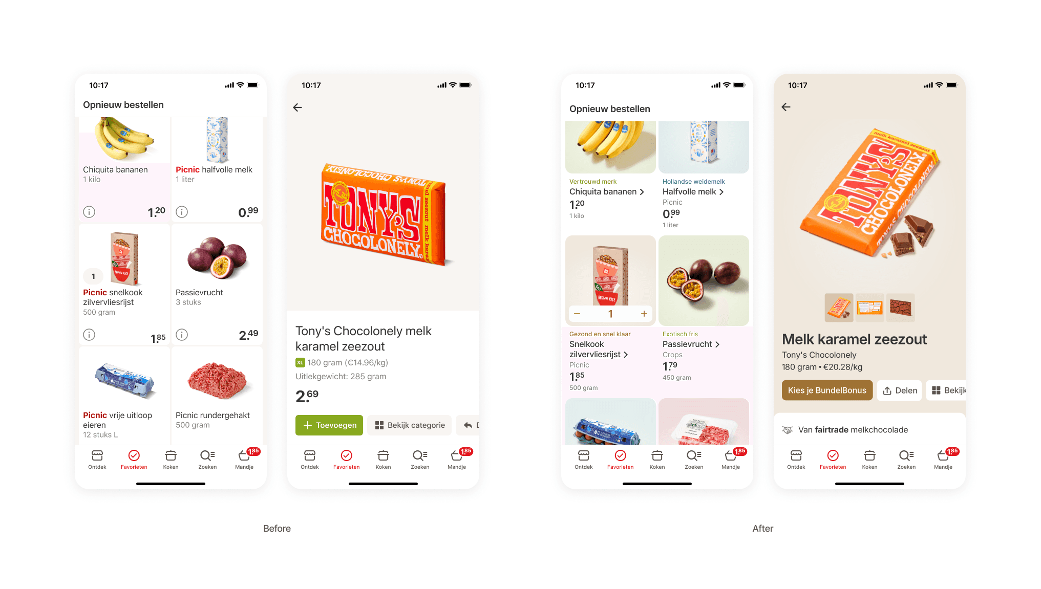 To address this, we set out to elevate our visual presentation, ensuring a consistent perception of quality and freshness. This involved reimagining one of our app's most essential components: the product tile. Key improvements included: